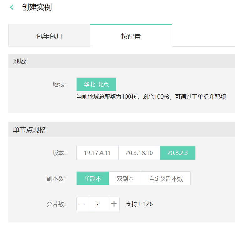 这里我们选最新版本20.0.2.3,下面两个参数比较重要,一个是副本数,一个是分片数,这里我们分别选单副本,2分片,ClickHouse中还有一个分区的概念,这三个名词初学者很容易混淆,我们后面单独讲。