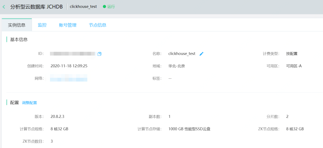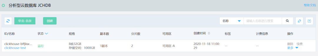 在京东智联云创建ClickHouse非常简单,用户在控制台“云服务”->“数据库与缓存”下选择“分析型云数据库JCHDB”进入实例列表界面,点击“创建”按钮,进入下面界面: