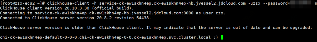 云主机上使用clickhouse-client命令连接到数据库,hostname和端口参考实例信息: