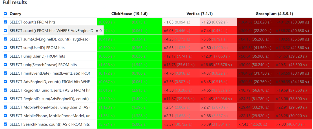 下图是ClickHouse官方提供的和主要竞品Vertica和Greenplum性能对比,从图中可以看出,即使和OLAP竞品相比,性能也要高1-2个数量级,和传统OLTP数据库就更不用说了。