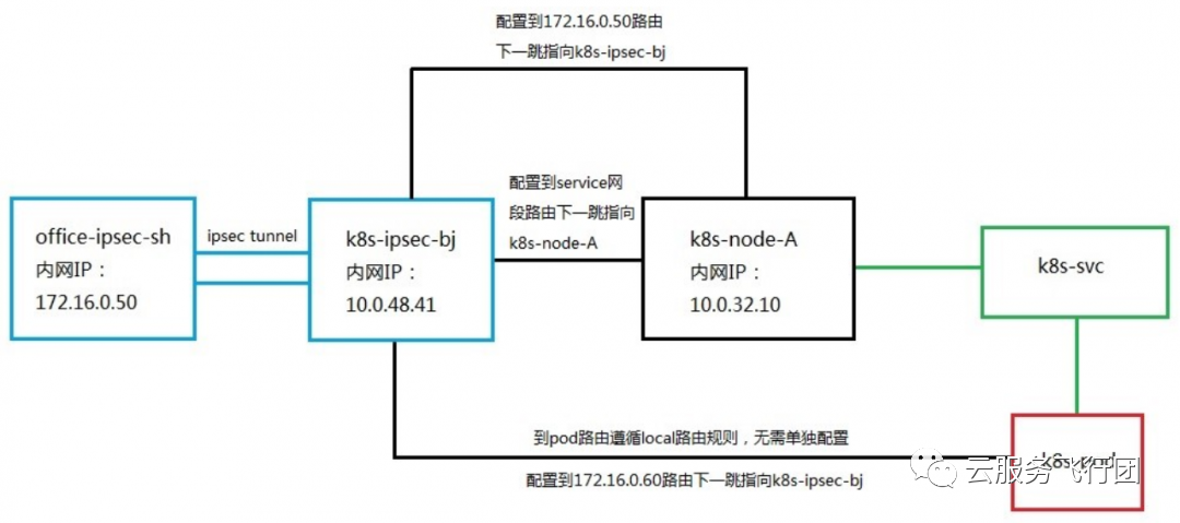 我们来看自建VPN方式,自建VPN在客户办公网和云上网络各有一个有公网IP的端点设备,两个设备之间建立加密通讯隧道,实际底层还是基于公网通讯。如果使用该方案,云上的端点我们可以选择和集群节点在同一VPC的不同子网下的有公网IP的云主机。办公网侧对service和pod的访问数据包通过VPN隧道发送至云主机后,可以通过配置云主机所在子网路由,将数据包路由至某个集群节点,然后在集群节点所在子网配置到客户端的路由下一跳指向端点云主机,同时需要在pod子网也做相同的路由配置。至于VPN的实现方式,通过和客户沟通,我们选取ipsec隧道方式。