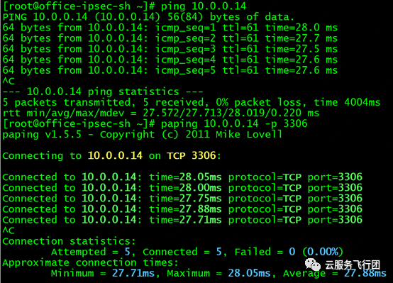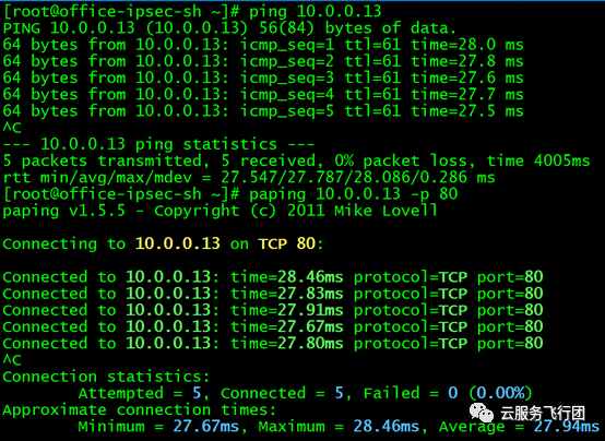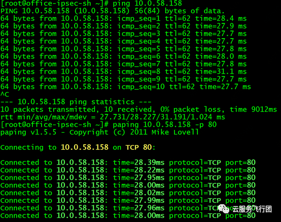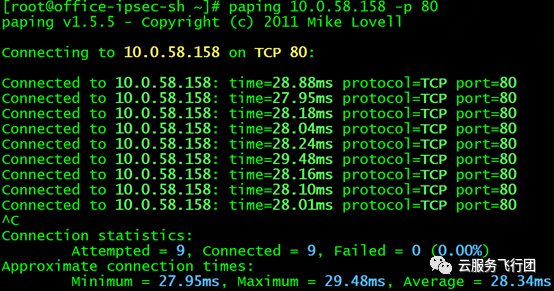 该服务后端的pod是10.0.0.13,部署nginx默认页面,并监听80端口。在上海云主机上测试ping service的IP 10.0.58.158,可以ping通,同时使用paping工具ping服务的80端口,也可以ping通!