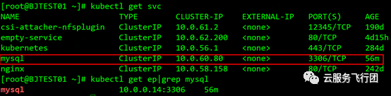 正当攻城狮心里美滋滋,以为一切都大功告成的时候,测试访问另一个service的结果犹如一盆冷水泼来。我们接着选取了mysql这个service,测试访问3306端口。该serivce的clusterIP是10.0.60.80,后端pod的IP是10.0.0.14