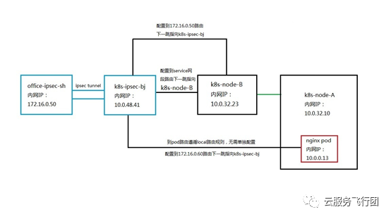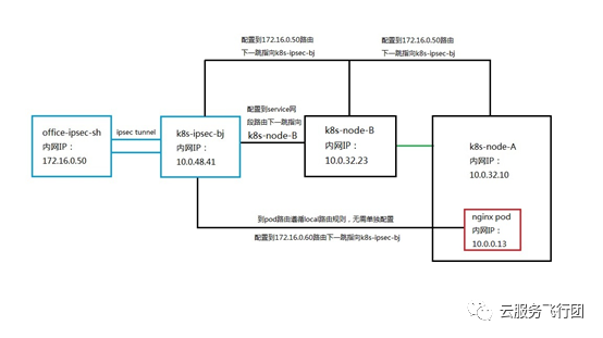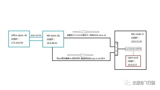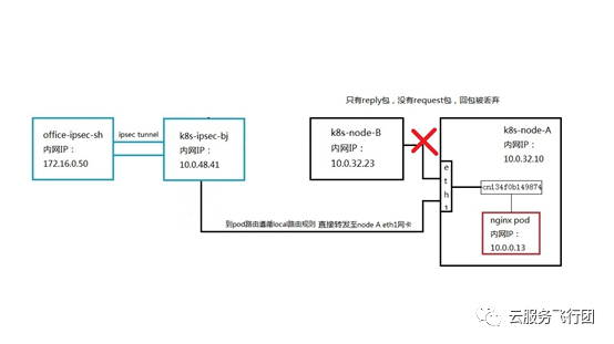 看到这里,机智的童鞋可能已经想到,那修改eth1所属的pod子网路由,让去往172.16.0.50的数据包下一跳不发送到k8s-ipsec-bj,而是返回给k8s-node-B,不就可以让回包沿着来路原路返回,不会被丢弃吗?是的,经过我们的测试验证,这样确实可以使客户端成功请求服务。但是别忘了,用户还有一个需求是客户端可以直接访问后端pod,如果pod回包返回给node B,那么客户端请求pod时的数据通路是怎样的呢?