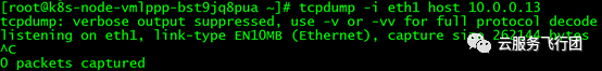 那么node A是否收到了客户端的请求包呢?pod又有没有给客户端回包呢?我们移步node A进行抓包。在node B上的抓包我们可以获悉node A上应该只有客户端IP和pod IP的交互,因此我们就从这两个维度抓包。根据之前抓包的分析结果,数据包进入节点内之后,应该通过虚拟设备cni34f0b149874与pod交互。而node B节点访问pod应该从node A的弹性网卡eth1进入节点,而不是eth0,为了验证,首先执行命令tcpdump -i eth0 host 172.16.0.50和tcpdump -i eth0 host 10.0.0.13,没有抓到任何数据包。