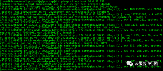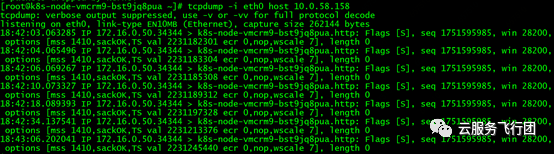 同时我们再执行tcpdump -i any host 10.0.58.158,对service IP进行抓包,