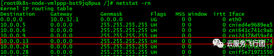 那么pod是通过哪个网络接口进行收发包的呢?执行命令netstat -rn查看node A上的网络路由,我们有了如下发现:
