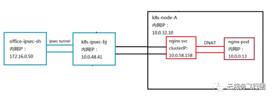 确定了方案,我们需要在测试环境实施方案验证可行性。由于我们没有云下环境,因此选取和K8S集群不同地域的云主机代替客户的办公网端点设备。在华东上海地域创建云主机office-ipsec-sh模拟客户办公网客户端,在华北北京地域的K8S集群K8S-BJTEST01所在VPC的NAT/LB子网创建一个有公网IP的云主机K8S-ipsec-bj,模拟客户场景下的ipsec云上端点,与华东上海云主机office-ipsec-sh建立ipsec隧道。设置NAT/LB子网的路由表,添加到service网段的路由下一跳指向K8S集群节点k8s-node-vmlppp-bs9jq8pua,以下简称node A。由于pod子网和NAT/LB子网同属于一个VPC,所以无需配置到pod网段的路由,访问pod时会直接匹配local路由,转发至对应的弹性网卡上。为了实现数据包的返回,在node子网和pod子网分别配置到上海云主机office-ipsec-sh的路由,下一跳指向K8S-ipsec-bj。完整架构如下图所示: