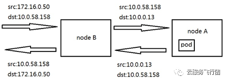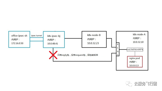 由于pod给客户端回包是从node A的eth1网卡发出的,所以虽然按照正常DNAT规则,数据包应该发回给node B上的service端口,但是受eth1子网路由表影响,数据包直接被“劫持”到了k8s-ipsec-bj这个主机上。而数据包到了这个主机上之后,由于没有经过service的转换,回包的源地址是pod地址10.0.0.13,目的地址是172.16.0.50,这个数据包回复的是源地址172.16.0.50,目的地址10.0.58.158这个数据包。相当于请求包的目的地址和回复包的源地址不一致,对于k8s-ipsec-bj来说,只看到了10.0.0.13给172.16.0.50的reply包,但是没有收到过172.16.0.50给10.0.0.13的request包,云平台虚拟网络的机制是遇到只有reply包,没有request包的情况会将request包丢弃,避免利用地址欺骗发起网络攻击。所以客户端不会收到10.0.0.13的回包,也就无法完成对service的请求。在这个场景下,数据包的通路如下图所示: