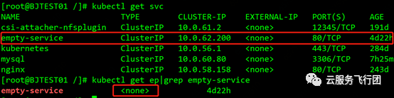 至此,我们搞清楚了为什么客户端请求转发至service后端pod不在的节点上时无法成功访问service的原因。那么为什么在此时虽然请求service的端口失败,但是可以ping通service地址呢?攻城狮推断,既然service对后端的pod起到DNAT和负载均衡的作用,那么当客户端ping service地址时,ICMP包应该是由service直接应答客户端的,即service代替后端pod答复客户端的ping包。为了验证我们的推断是否正确,我们在集群中新建一个没有关联任何后端的空服务,如图所示: