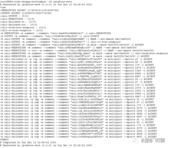 既然费尽周折找到了访问失败的原因,接下来我们就要想办法解决这个问题。事实上只要想办法让pod跨节点给客户端回包时隐藏自己的IP,对外显示的是service的IP,就可以避免包被丢弃。原理上类似于SNAT(基于源IP的地址转换)。可以类比为没有公网IP的局域网设备有自己的内网IP,当访问公网时需要通过统一的公网出口,而此时外部看到的客户端IP是公网出口的IP,并不是局域网设备的内网IP。实现SNAT,我们首先会想到通过节点操作系统上的iptables规则。我们在pod所在节点node A上执行iptables-save命令,查看系统已有的iptables规则都有哪些。