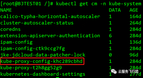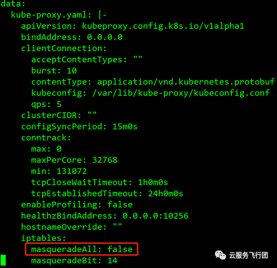 我们决定测试开启下--masquerade-all这个参数。kube-proxy在集群中的每个节点上以pod形式运行,而kube-proxy的参数配置都以configmap形式挂载到pod上。我们执行kubectl get cm -n kube-system查看kube-proxy的configmap,如图所示: