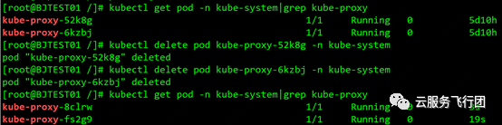 要想使配置生效,需要逐一删除当前的kube-proxy pod,daemonset会自动重建pod,重建的pod会挂载修改过的configmap,masqueradeALL功能也就开启了。如图所示: