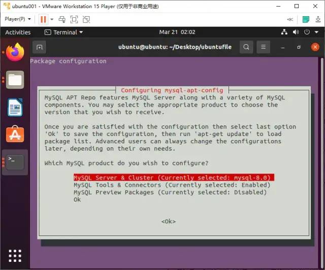默认情况下,MYSQL服务器和其他必需组件的所有安装和升级都来自配置包的安装过程中选择的主要版本的发行系列。但是,您可以随时通过重新配置已安装的配置包来切换到另一个受支持的主要发行系列。使用以下命令。sudo dpkg-reconfigure mysql-apt-config然后,将出现一个对话框,要求您选择所需的主要发行版本。然后选择,然后选择确定。返回命令提示符后,使用以下命令从MYSQL APT存储库更新软件包信息: