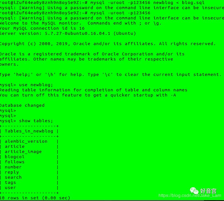 自行替换上面的blog数据库的名字 和生成数据库的名字(blog.sql)