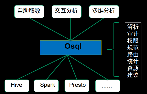 于是基于大一统的思路,我们希望在众多Olap(Online Analytical Processing联机分析处理)引擎之上构建一个统一智能路由层,把查询引擎的各种公用模块抽离到Osql实现,比如权限校验、SQL规范检查、查询审计等等。最终向用户提供统一的查询入口,并根据查询历史,优化数据源在各个查询引擎上的分布,从而智能地将查询路由到合适的查询引擎。”小Q介绍道。