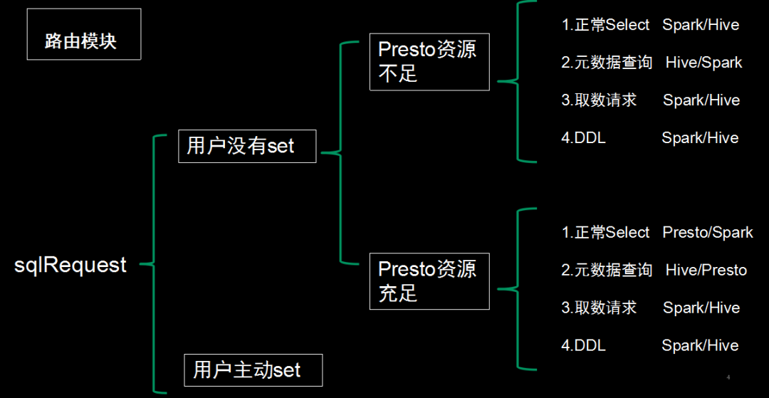 “我明白了,他们是根据一些场景来划分的。如果用户是高阶玩家,就遵从用户的意愿,比如用户set engine=presto,那么这个查询就会用presto来运行;如果用户没有主动set,Osql会考虑当前的集群资源情况以及SQL具体的使用场景,比如元数据、取数、DDL和正常Select,来选择当前最合适的查询引擎。”