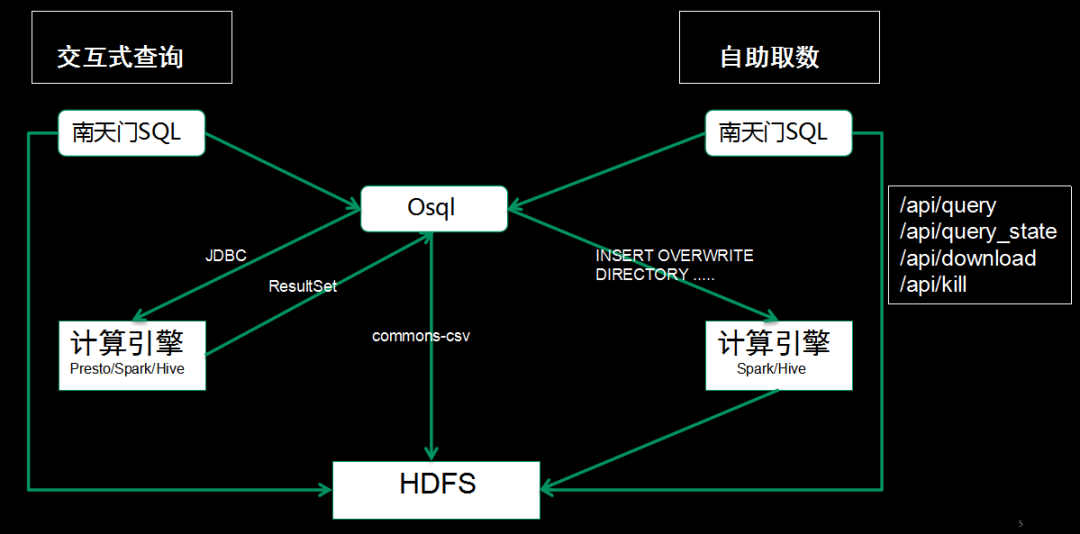取数则采用Insert Overwrite Directory方式。主要原因是,一般取数面向的场景,查询结果比较大,如果都用JDBC+CSV的方式,Osql机器容易内存不足,因为查询结果留太多内存数据,因而将数据写到HDFS某一个目录,用户需要可自取。”小Q解释说。