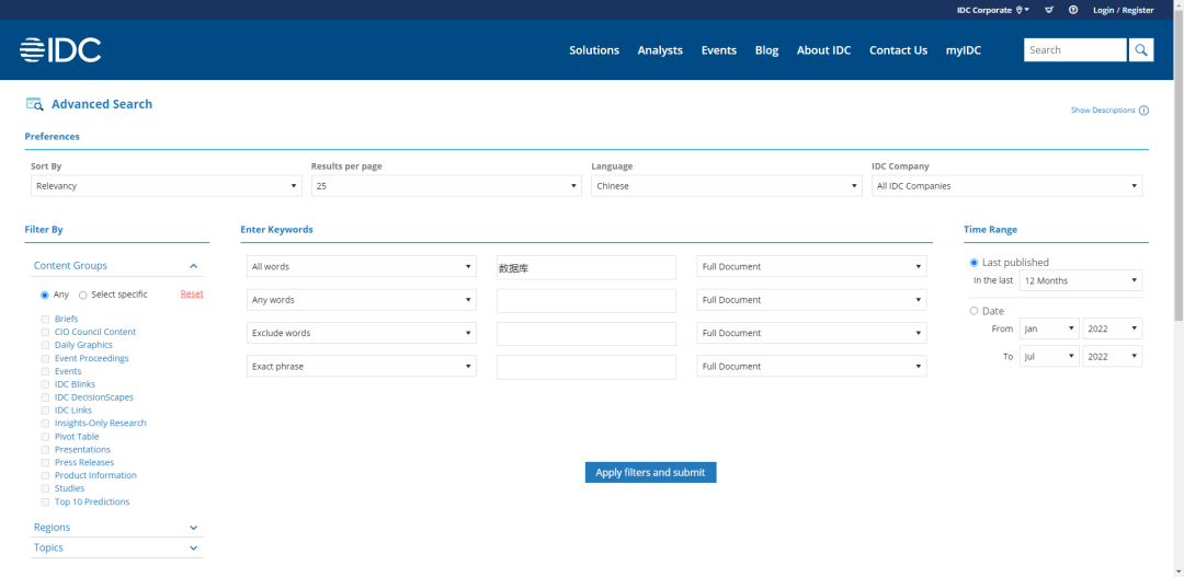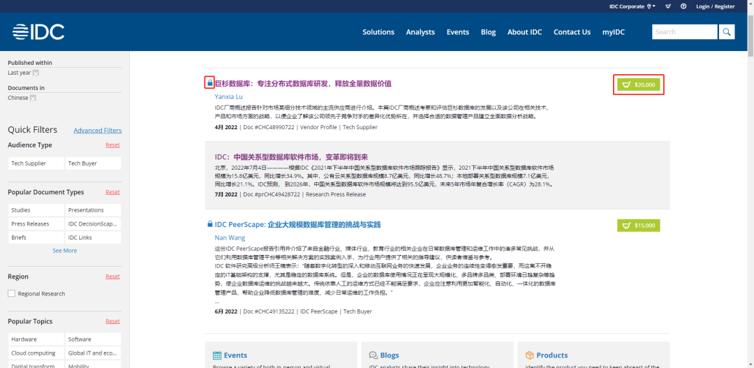 IDC大部分研究报告都是收费的,毕竟靠这个吃饭,但是会提供一些有限的免费资源,可以从首页找到检索窗口,