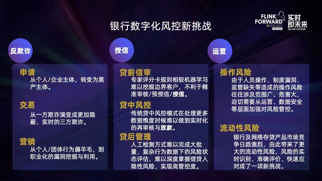 银行业务的申请、交易、营销等环节都可能存在欺诈行为,随着技术发展,在欺诈行为团伙化、隐蔽化、专业化、实时化情况下进行反欺诈难度越来越大。同时,随着业务种类增多,传统的专家规则评分卡模型难以应付复杂的风控场景,需要借助大数据、实时计算、机器学习、知识图谱等高新技术打造高质量的授信能力。此外,是否能够及时发现和化解业务运营风险,包括流程风险、员工异常行为、资产及负债流动性风险也面临较大挑战。