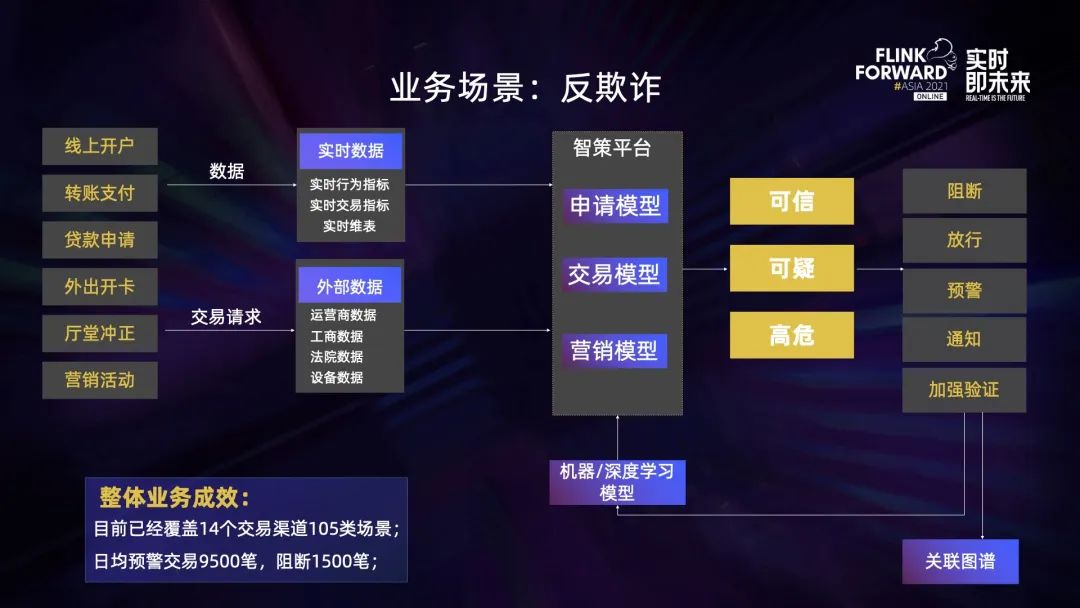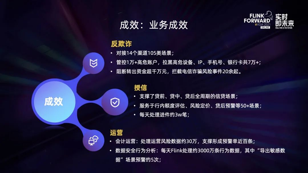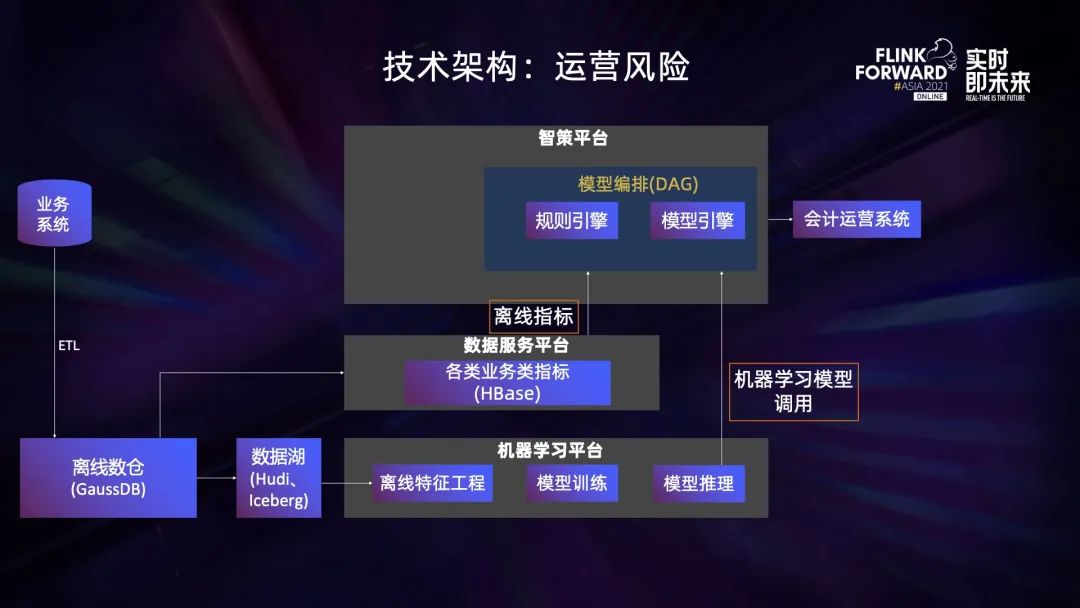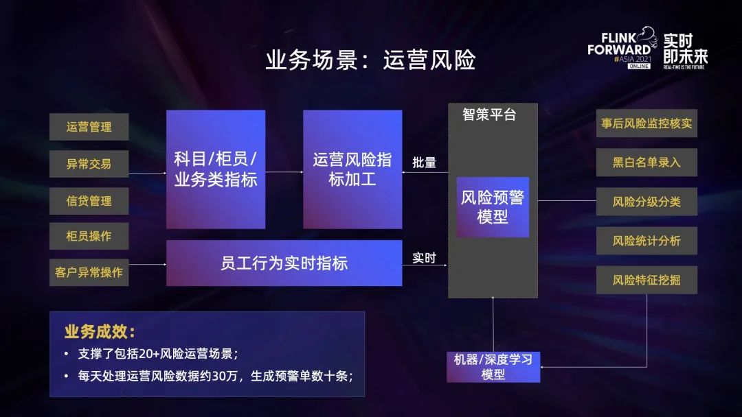 运营风险的技术架构比较直观,每天将历史业务数据同步到数据仓库,在数仓中完成风险指标的加工,同时离线数据也会被用于模型训练。智策平台每天定时对离线指标进行规则运算,并将风险预警结果推送给下游运营系统。业务成效方面,反欺诈系统对接了 14 个渠道,105 类场景,在传统反欺诈技术上引入流计算实现实时反欺诈,助力管控了 1 万多高危账户,协助阻断转出资金超千万元,实现了全年线上交易零欺诈损失。授信方面,支撑了全周期的信贷场景,包括额度评估、风险定价、贷后预警等 50 多个场景,每天处理进件 3 万余笔。每天批量处理运营指标数据 30 余万,同时通过 Flink 每天实时处理员工行为数据约 3000 万条,具备实时发现内部的高风险行为的能力。