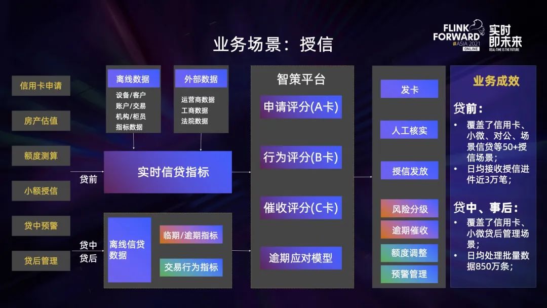 对授信狭义且简单的理解就是金融机构向客户提供资金的行为。智策平台通过评分卡、决策集等方式承载了贷前阶段 50 余个场景,日均接收授信请求约 3 万笔;对于以批量数据处理为主的贷中、贷后环节,日均处理数据 1300 万条。