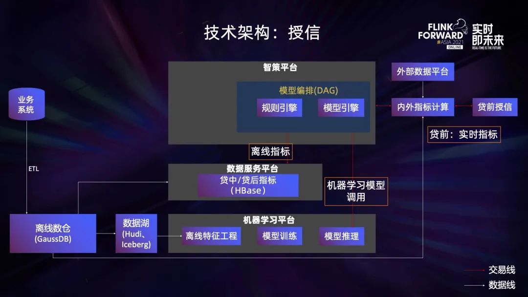 技术实现方面,针对交易请求,智策平台会根据 DAG 编排逻辑来调用不同的计算引擎,并返回计算结果。同时,实时计算平台会使用交易系统数据库的变化数据计算交易/行为等实时指标。此外,历史数据会被抽取到离线数仓和数据湖中,供下游的机器学习平台使用。