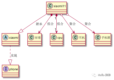 符号:空心菱形+箭头+实线,菱形指向整体,箭头指向部分