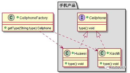 package com.company.demo01factory;public class Test {public static void main(String[] args) {CellphoneFactory cpf = new CellphoneFactory();Cellphone xiaomi = cpf.getType("xiaomi");xiaomi.type();}}