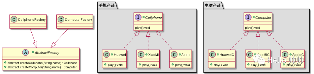 package com.company.demo02abstractFactory;import com.company.demo02abstractFactory.cellphone.Apple;import com.company.demo02abstractFactory.cellphone.Cellphone;import com.company.demo02abstractFactory.cellphone.Huawei;import com.company.demo02abstractFactory.cellphone.Xiaomi;import com.company.demo02abstractFactory.computer.Computer;public class CellphoneFactory extends AbstractFactory {@OverrideCellphone createCellphone(String name) {return switch (name) {case "Apple" -> new Apple();case "Huawei" -> new Huawei();case "Xiaomi" -> new Xiaomi();default -> null;};}@OverrideComputer createComputer(String name) {return null;}}