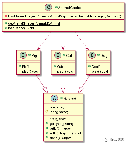 package com.company.demo05prototype;import java.util.Hashtable;public class AnimalCache {private static Hashtable<Integer, Animal> AnimalMap= new Hashtable<Integer, Animal>();public static Animal getAnimal(Integer AnimalId) {Animal cachedAnimal = AnimalMap.get(AnimalId);return (Animal) cachedAnimal.clone();}public static void loadCache() {Cat Cat = new Cat();Cat.setId(1);AnimalMap.put(Cat.getId(),Cat);Dog Dog = new Dog();Dog.setId(2);AnimalMap.put(Dog.getId(),Dog);Pig Pig = new Pig();Pig.setId(3);AnimalMap.put(Pig.getId(),Pig);}}