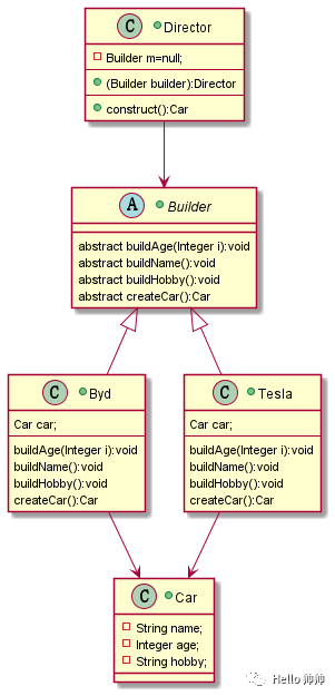 package com.company.demo04builder;// 抽象 builder 类public abstract class Builder {abstract void buildAge(Integer i);abstract void buildName();abstract void buildHobby();abstract Car createCar();}