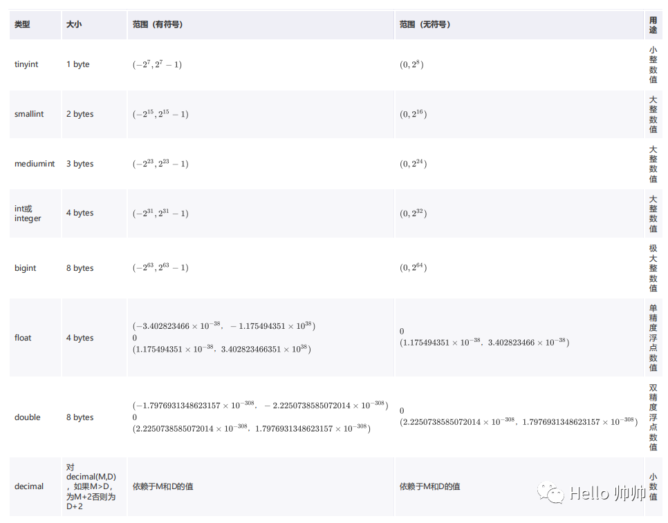 | longtext | 0-4 294 967 295 bytes | 极大文本数据 |