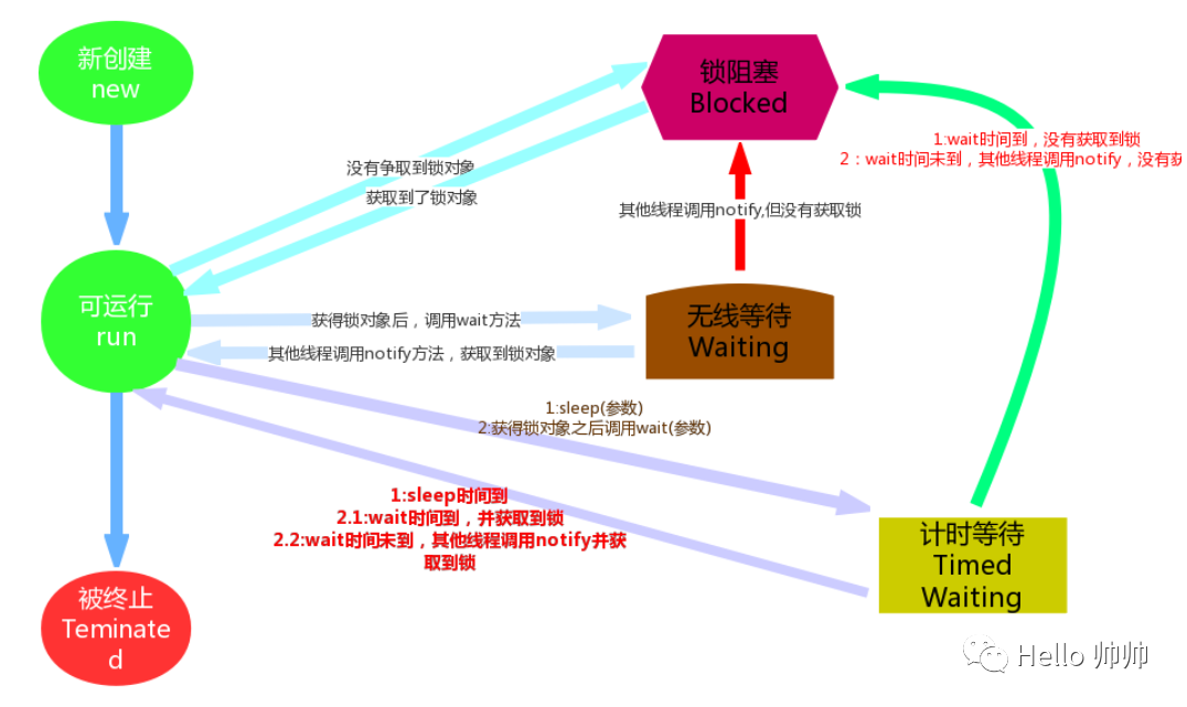 wait:线程不再活动,不再参与调度,进入 wait set 中,因此不会浪费 CPU 资源,也不会去竞争锁了,这时的线程状态即是 WAITING。它还要等着别的线程执行一个特别的动作,也即是通知(notify)在这个对象等待的线程从wait set 中释放出来,重新进入到调度队列(ready queue)中