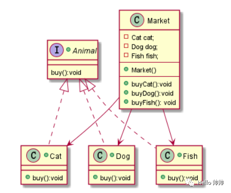 public class Market {private final Cat cat;private final Dog dog;private final Fish fish;public Market() {cat = new Cat();dog = new Dog();fish = new Fish();}public void buyCat() {cat.buy();}public void buyDog() {dog.buy();}public void buyFish() {fish.buy();}}