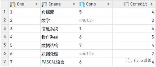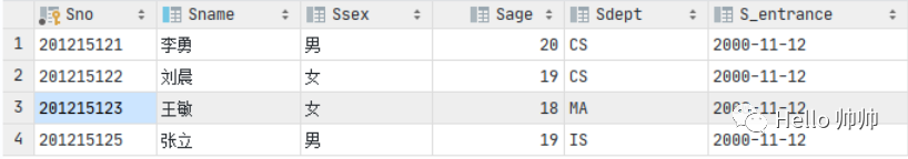 # 查询全体学生的学号与姓名。SELECT Sno, SnameFROM Student;# 查询共有多少专业SELECT distinct SdeptFROM Student;# 给查询的列起别名SELECT Sname 姓名FROM Student;