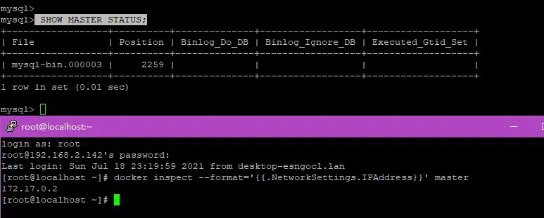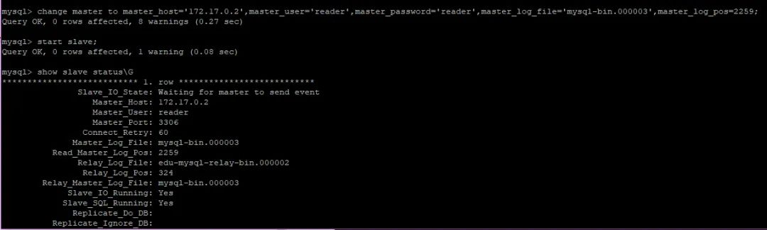 change master to master_host='172.17.0.2',master_user='reader',master_password='reader',master_log_file='mysql-bin.000003',master_log_pos=2259;
