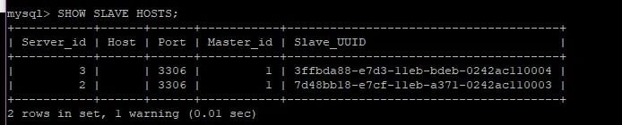 能从主服务器查询到两台从服务器的ID以及端口。完成MySQL部署。