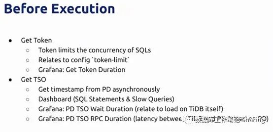 A. 在执行sql之前先获取Token 和Start TS ,Token用于限制sql的并发数,避免TiDB被资源耗尽而挂掉(如果获取Token耗时较高说明达到了Token上限,有sql排队等待)