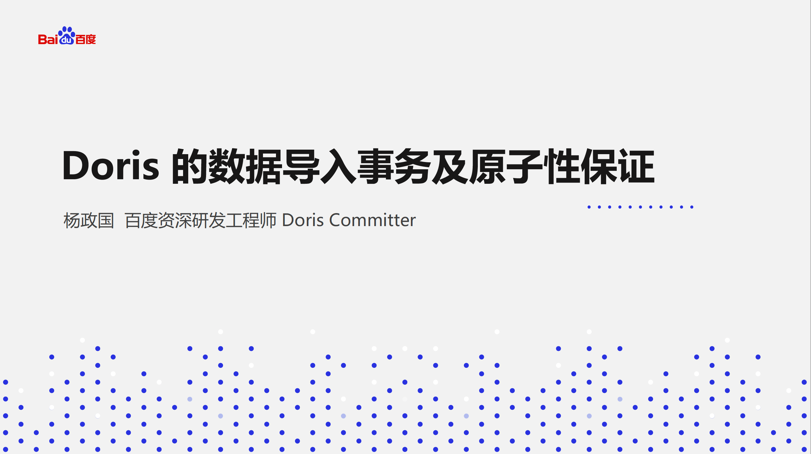 在01月14日由AICUG和示说网举办的线上数据工程架构沙龙中,来自百度的资深研发工程师杨政国带来了精彩的Doris导入事务的实现分享。