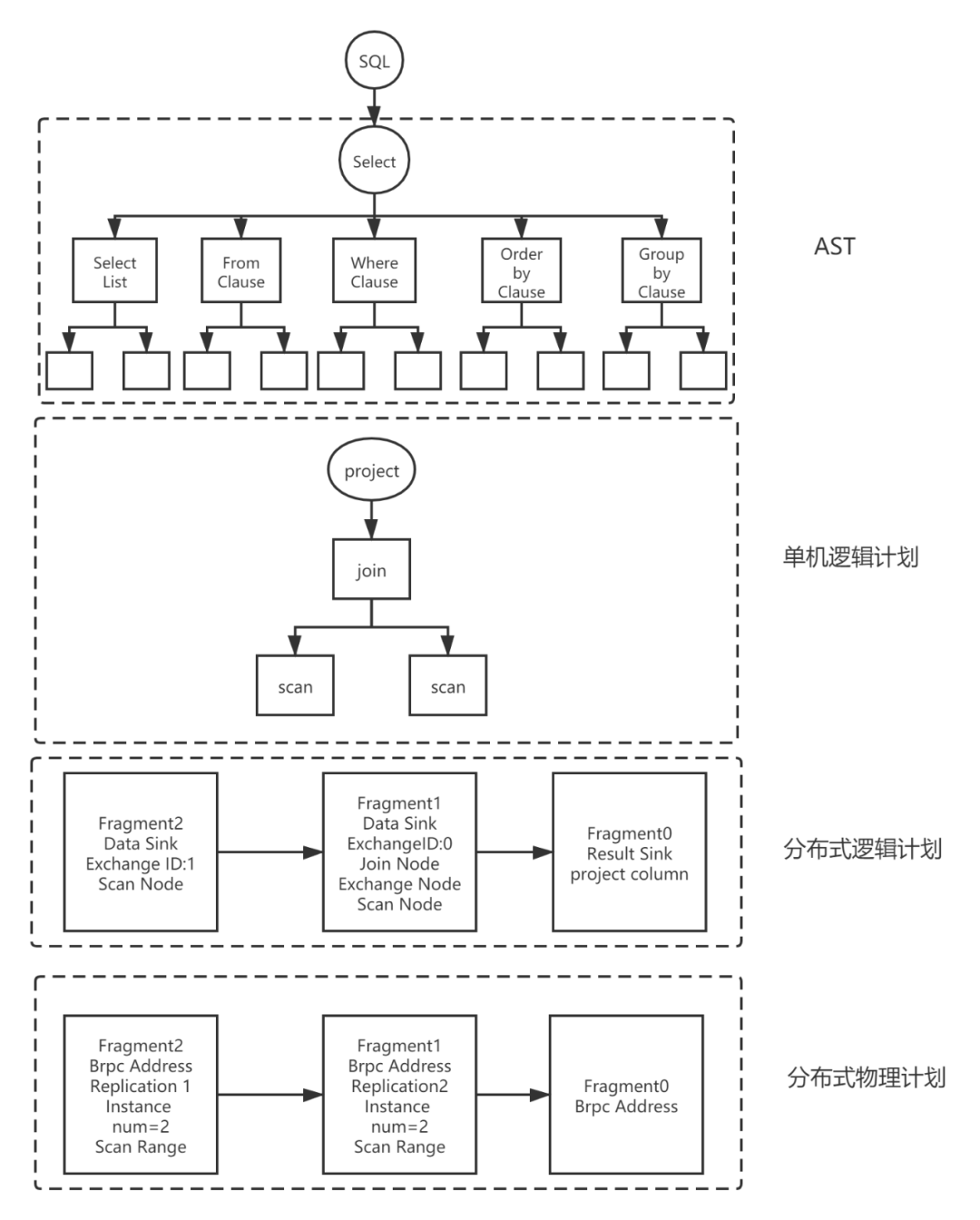 Doris SQL解析具体包括了五个步骤:词法分析,语法分析,生成单机逻辑计划,生成分布式逻辑计划,生成物理执行计划。