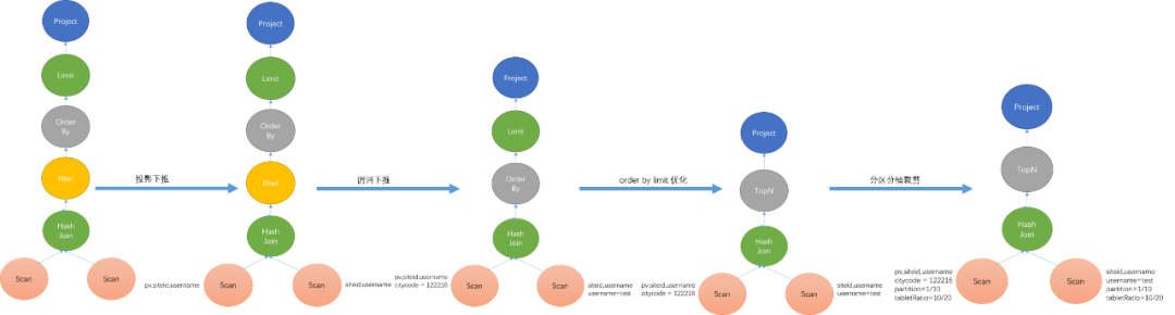 · Sort + Limit 优化成 TopN:对于order by limit语句会转换成TopN的操作节点,方便统一处理。