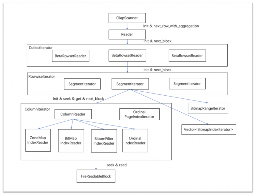 读取流程为写入的逆过程,但读取流程相对复杂些,主要因为进行大量的读取优化。整个读取流程分为两个阶段,一个是init流程,一个是获取next_block数据块的过程。具体过程如下图所示: