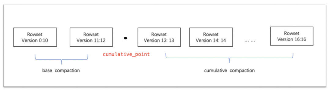 如上图所示,Compaction任务分为两种,base compaction和cumulative compaction。cumulative_point是分割两种策略关键。