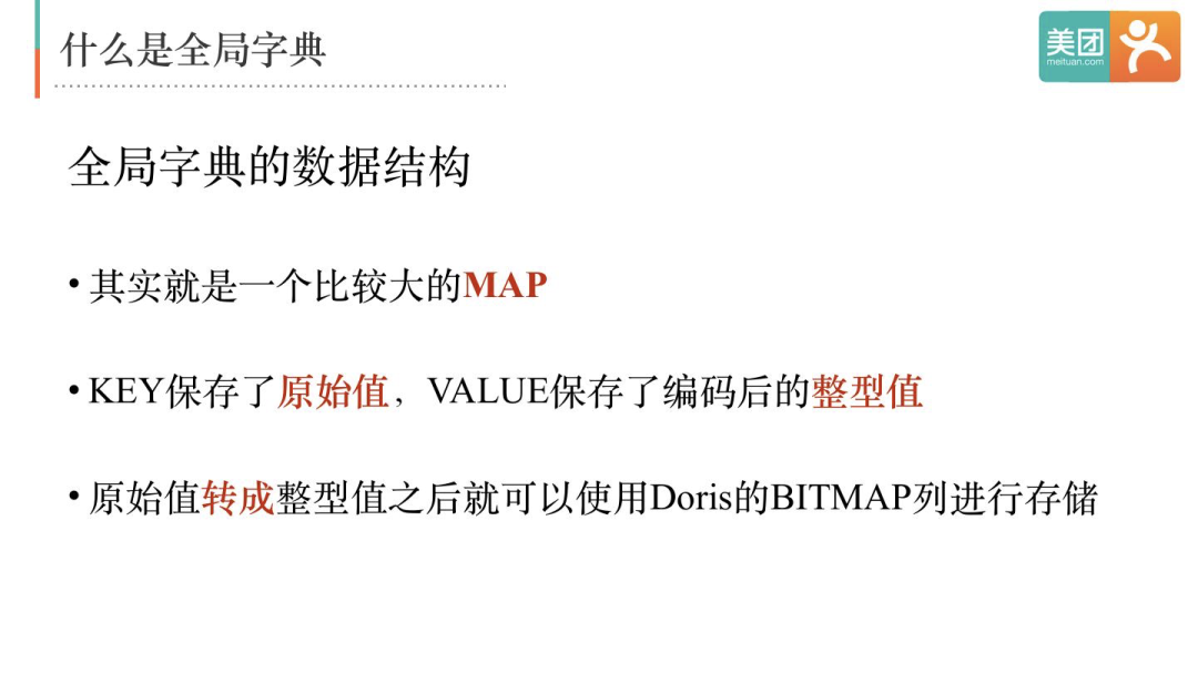 目前Doris的BITMAP列已经⽀持了对于整型的精确去重计算,但是现实的场景是业务会有更多的数据类型需要精确去重,比如String,这些非整型的数据类型是无法直接存入BITMAP的。