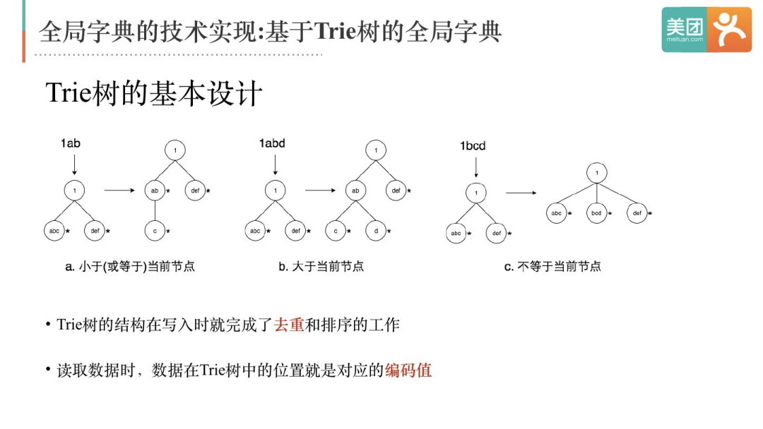 根据Trie树的特性我们可以得出一个结论——Trie结构在数据写入的时候就已经完成了去重和排序的工作(其实我们主要利用它去重的特点)。在读取数据时,数据在Trie树中的位置就是对应的编码值。也就是说,当数据写入完成时就达到了我们的预期——去重以及对数据的编码。