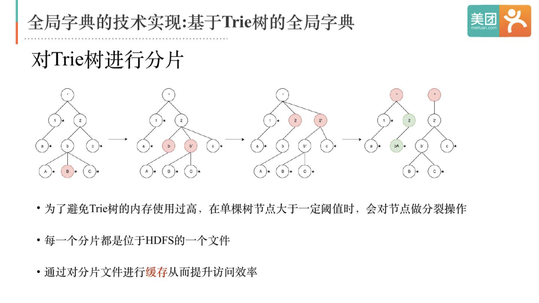 在实际的线上环境中有一个Trie树是不够的,因为通常Trie树非常大,小的可能几十MB上百MB,大的几十GB上百GB都有,所以一定要做树的分裂操作。
