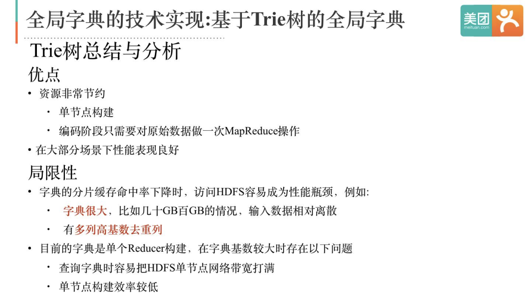 (2)使用Trie树与Hive表融合的方案,这个方向是一个很理想的设计,但是改造成本会非常高。在大部分情况下使用Trie树做字典的编码,在基数高字典大的情况下就把Trie树转成Hive表然后使用Join完成编码。不过这套方案的改造成本比较高,比如写入时Trie树支持分布式构建,读取时需要能转成SparkRDD再转成Hive表。