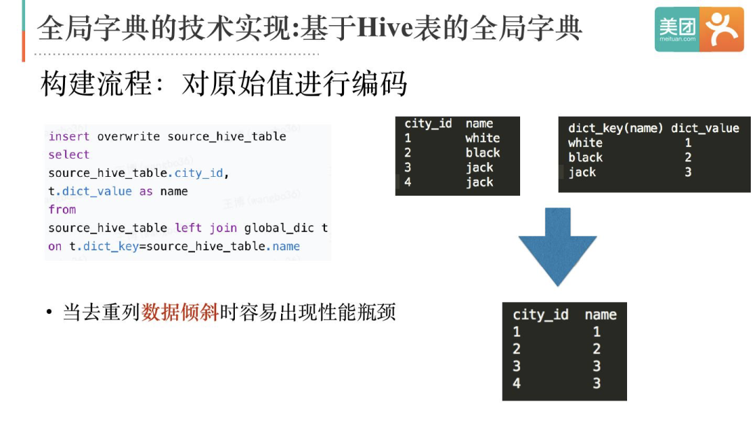 右上方左边的表是原始表(Hive表),右边是我们对name列编码后的字典,这样我们只需要用原始表的name列和字典表的dict_key(name)列做一个join就能得到右下所示的表。这就完成了对原始表进行编码的操作。