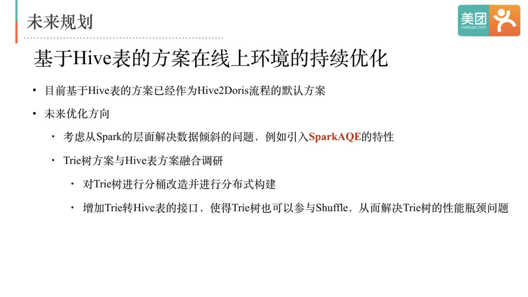 (1)考虑从Spark的层面解决数据倾斜的问题,比如引入SparkAQE特性(当Join时发现单个节点处理数据量过大时,会把数据做一个分发,引入多个节点去处理倾斜的数据,这样就可能会解决数据倾斜的问题),未来如果引入这一特性,整套 SparkSQL+Hive 做字典的方案将会没有明显的瓶颈。
